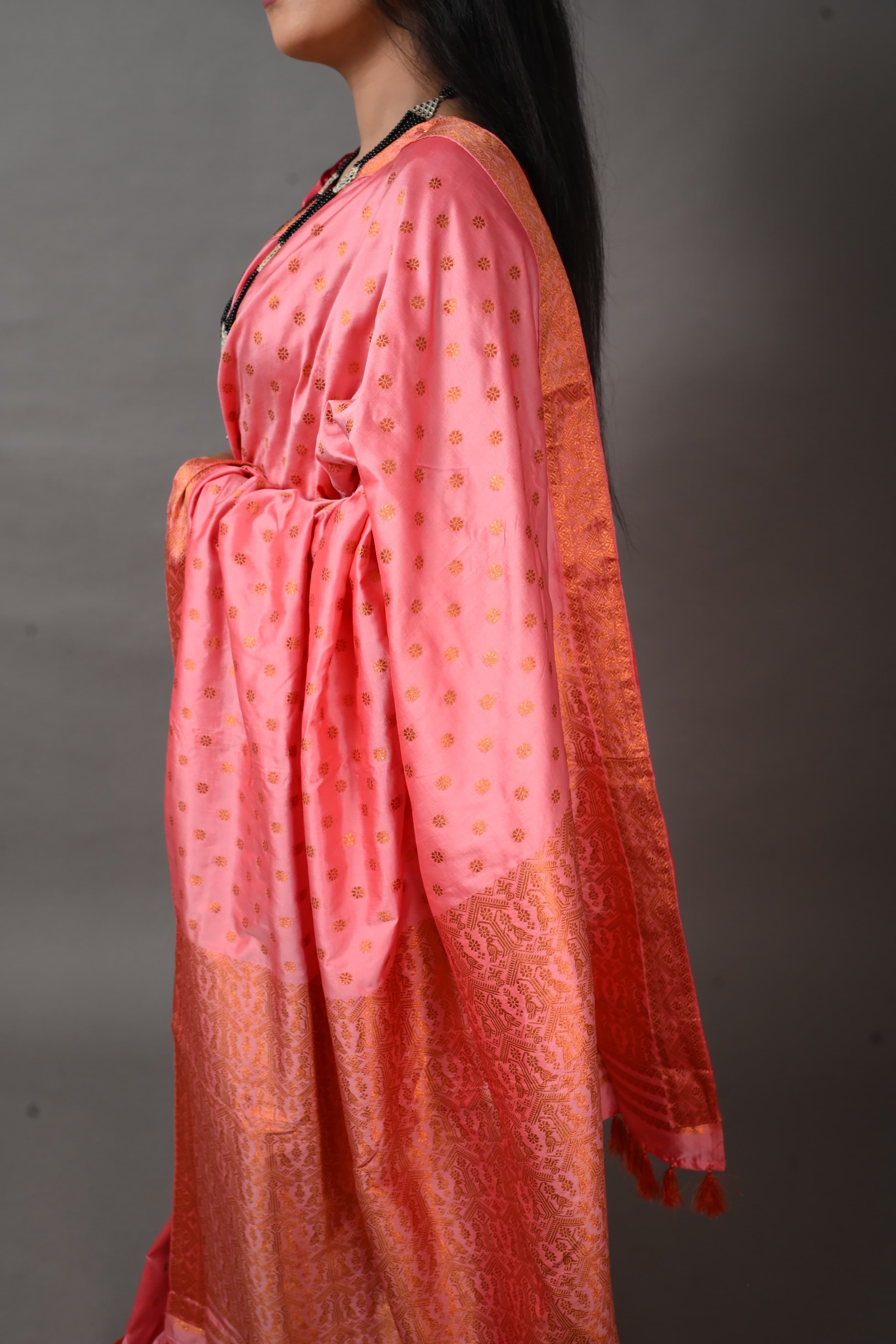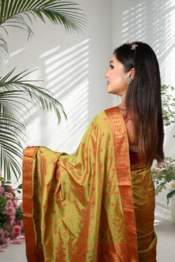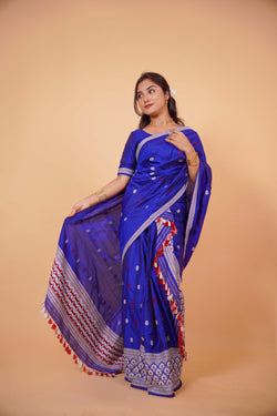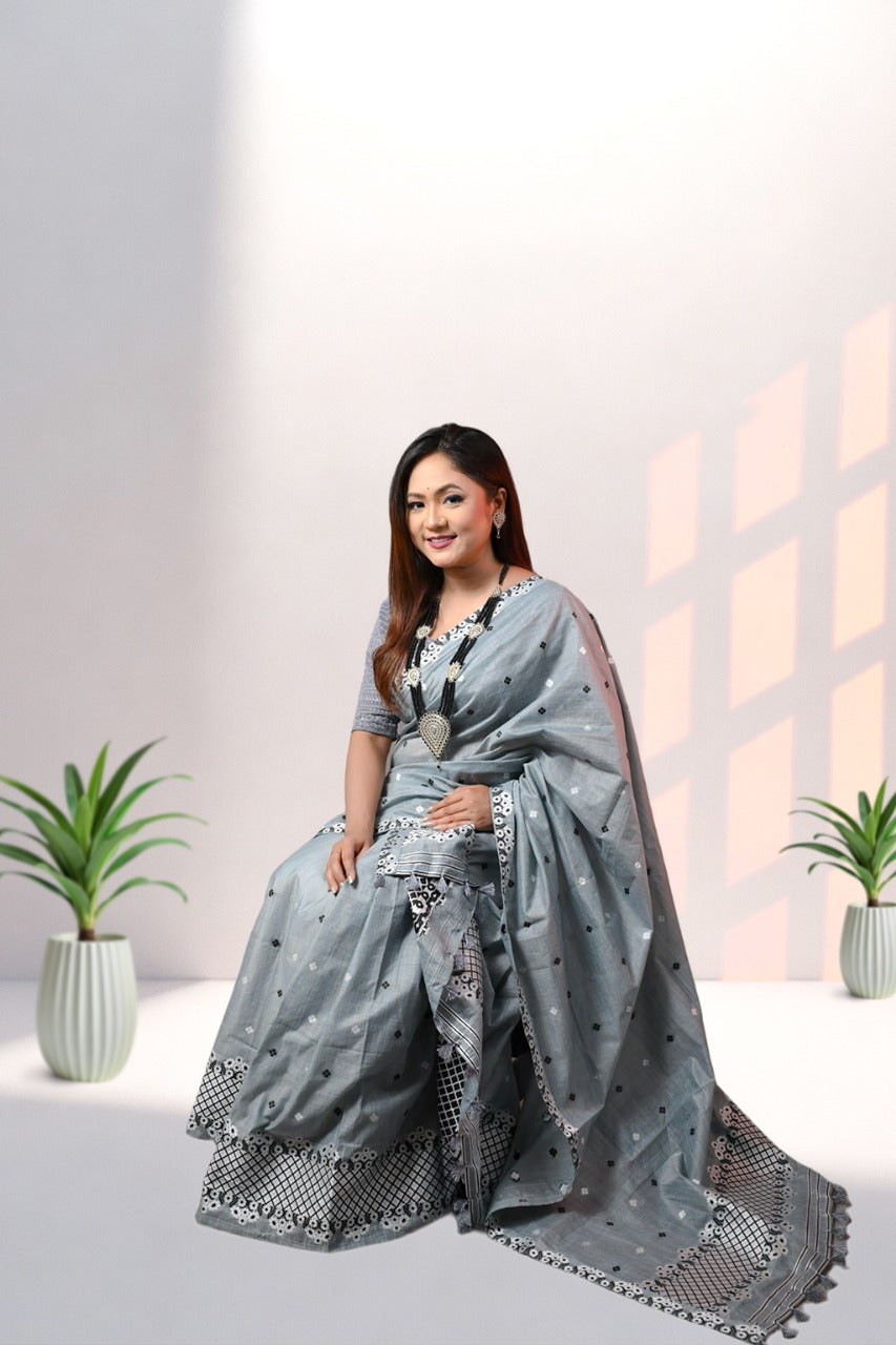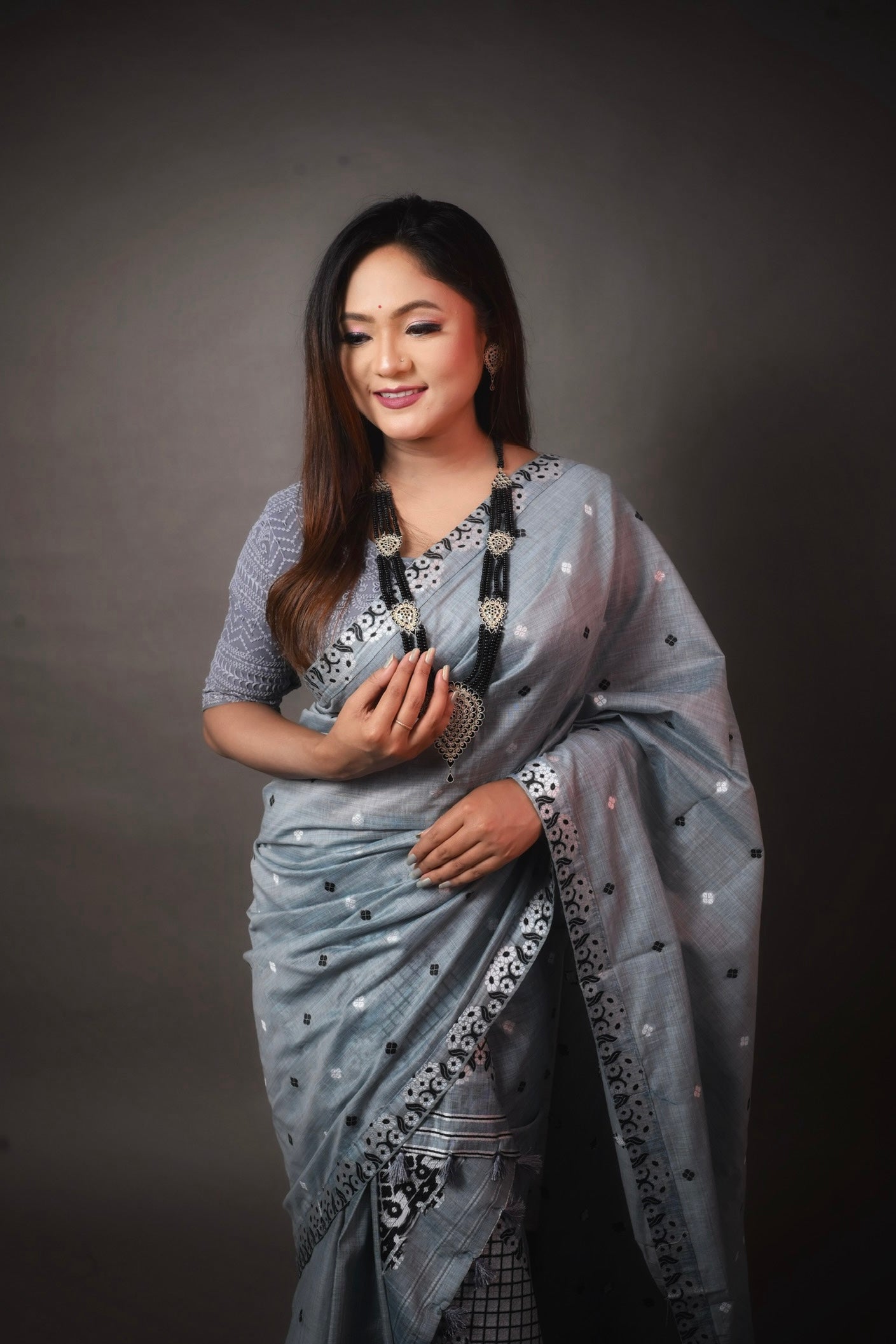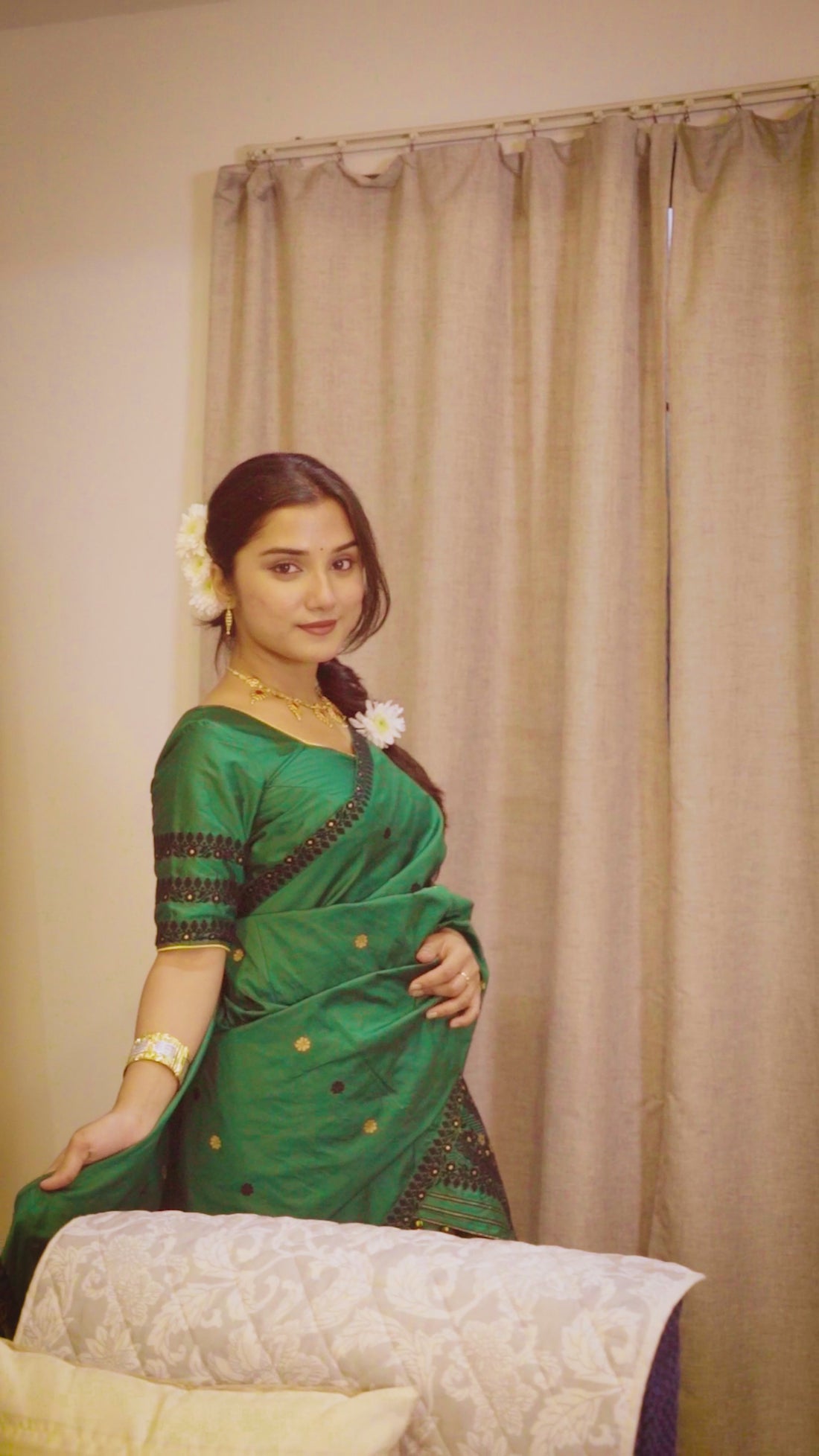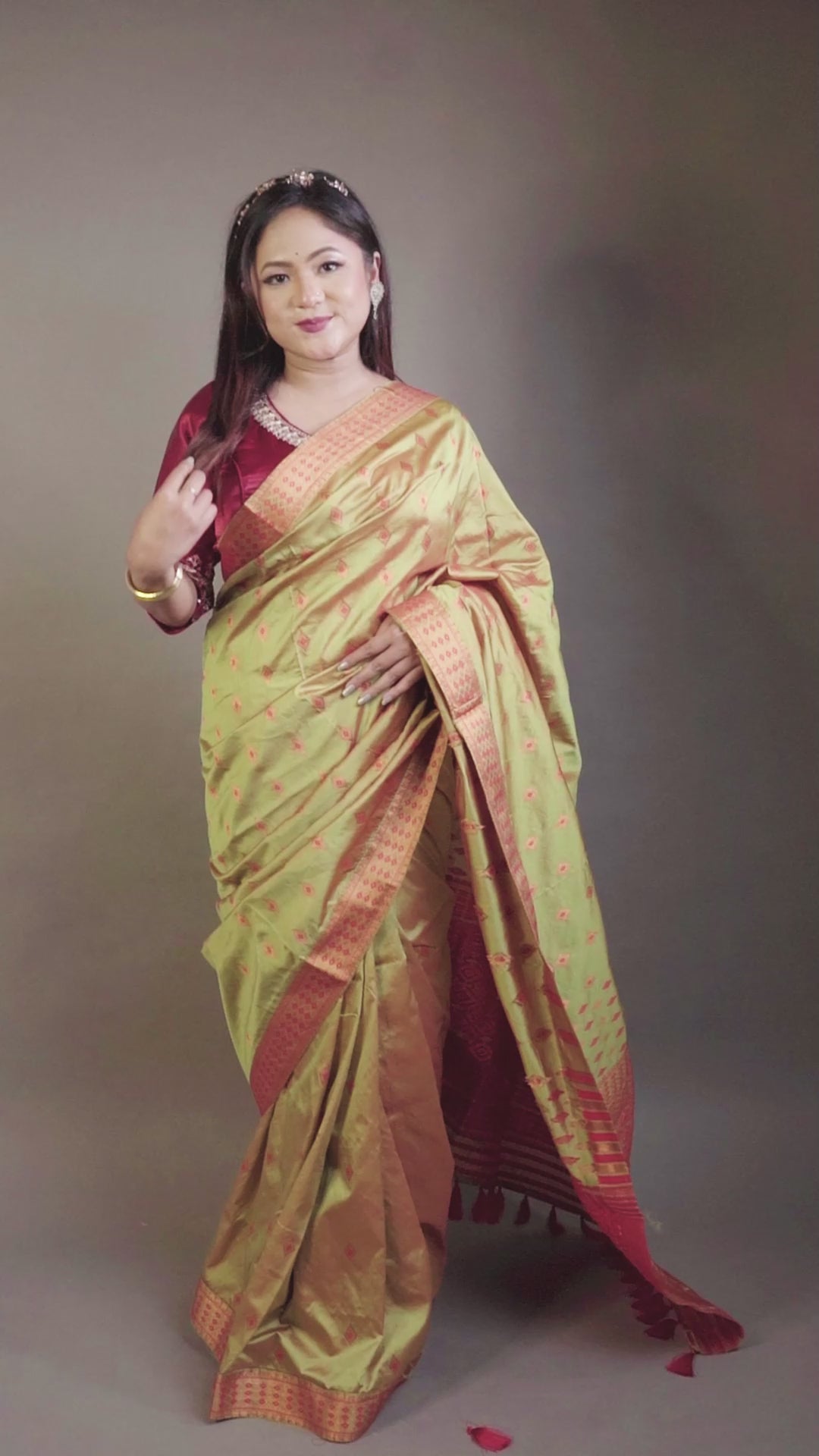 Every thread of this mekhela chador carries more than just color—it carries the rhythm of the loom, the patience of the artisan, and the heritage of Assam. Handwoven in Sualkuchi, the weaving village of Assam, this piece is the result of generations of dedication.